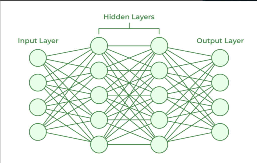 The input layer contains the input parameters, the hidden layer handles the data processing, and the output layer is the result returned from n parameters (the prediction); think of it as a mathematical function