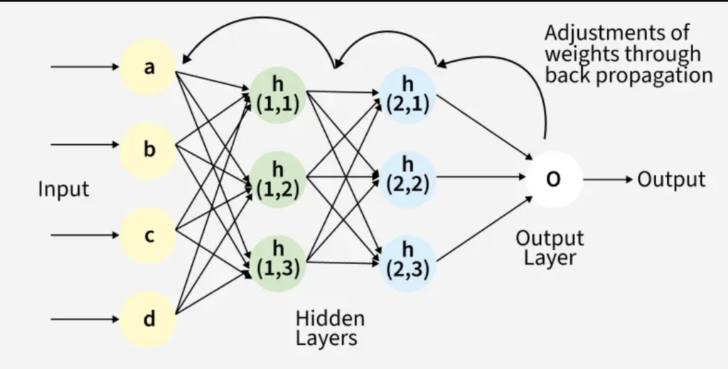 - It uses an algorithm called backpropagation to go back and say, “Hey, this connection was responsible for the error, let’s reduce its weight”