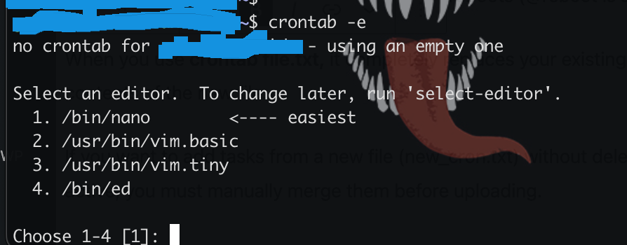 The first time you open crontab you will be asked to choose a text editor (such as nano or vi), its numeric option
