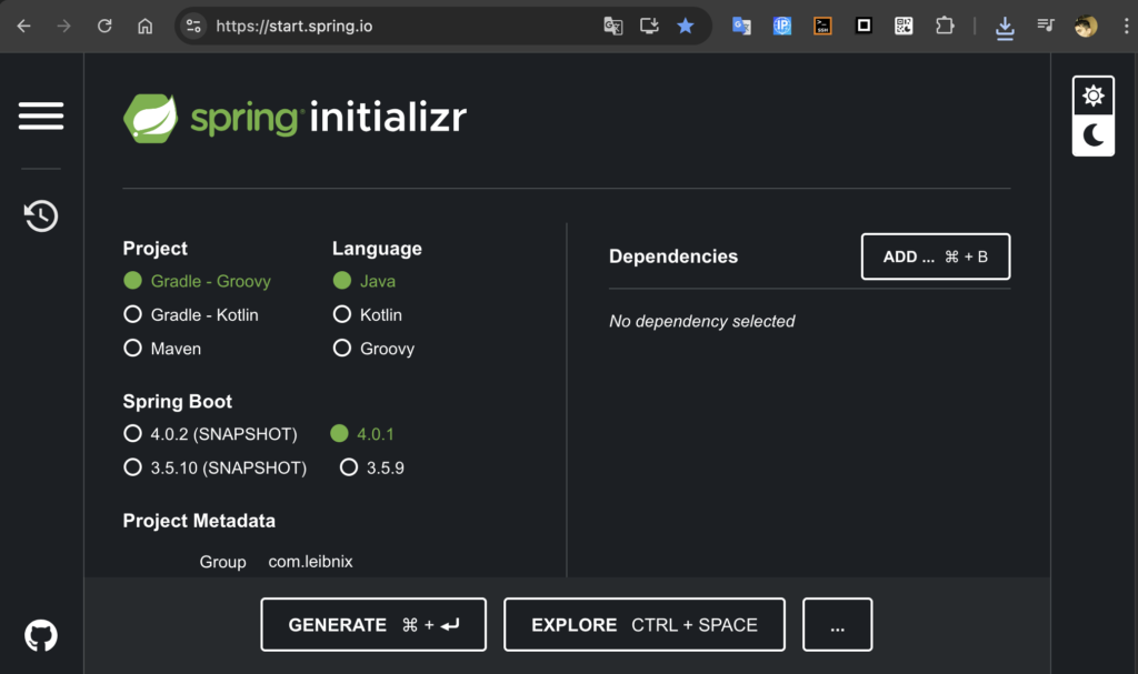 - Add dependencies for your project (Web, Data JPA, Security, etc.)