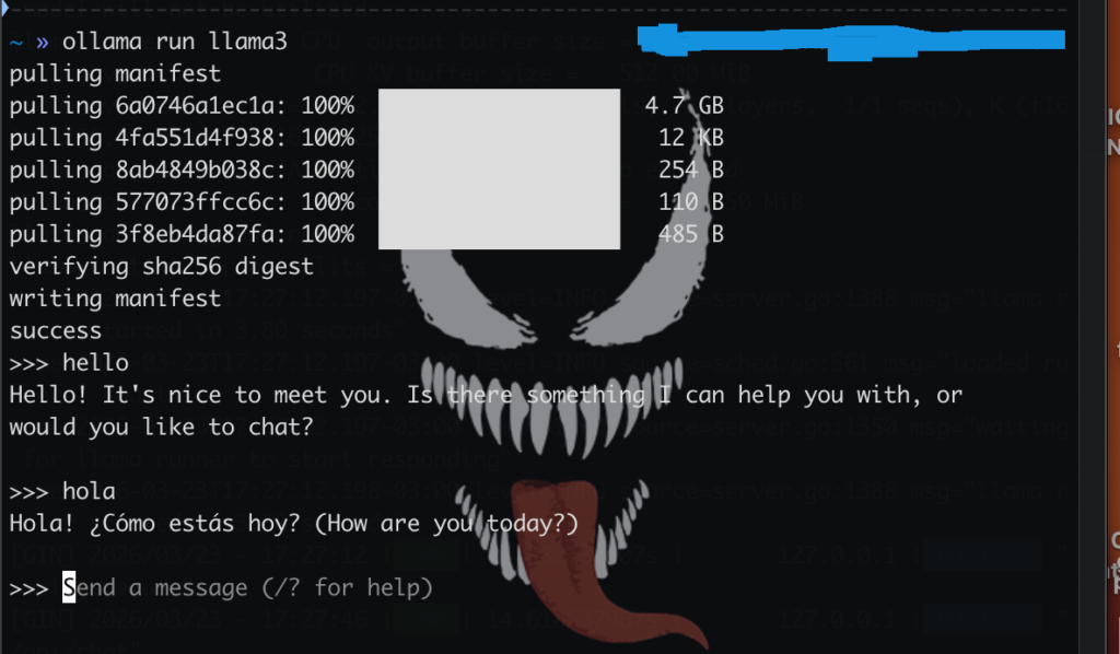 - What will happen? Ollama will detect that you don’t have the model, download it (it’s about 4.7 GB), and then a cursor will appear saying >>>.