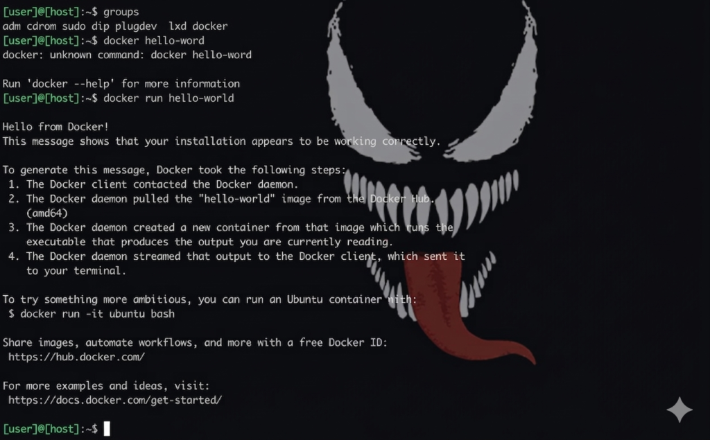3. Verify: Type groups. If docker appears in the list, it’s permanently installed