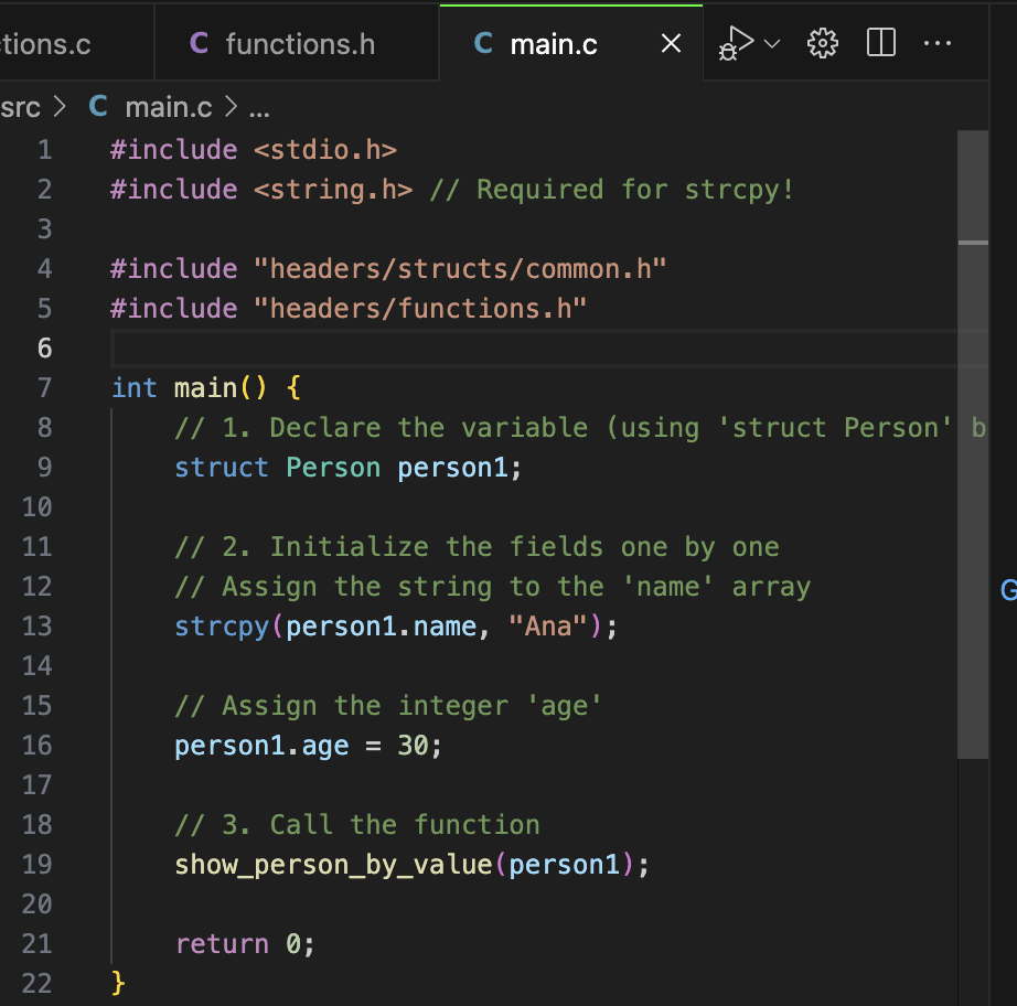 printf("Name: %s\n", p1.name); // Output: Name: Ana