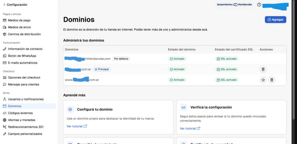 entras a tiendanube a configuración/dominios (previamente debes tener el dominio xxxx.com/xxxxx.com.ar/xxxx.lo-que-sea (configuración esta en el menú de la izquierda en tiendanube).